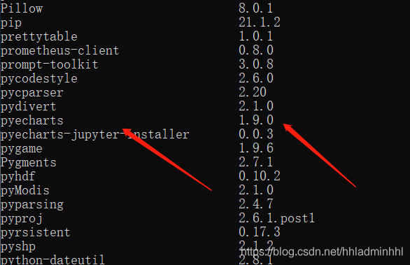 安装完成后, 可通过pip list指令查看python安装的库列表。查看pyecharts安装版本和是否安装成功。