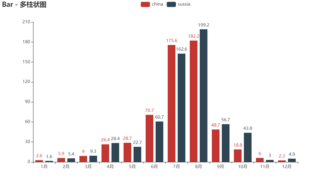 此外,还可以在一个柱状图中添加多个 y 轴记录,实现多个柱状对比,只需调用多一次 add_yaxis 即可。