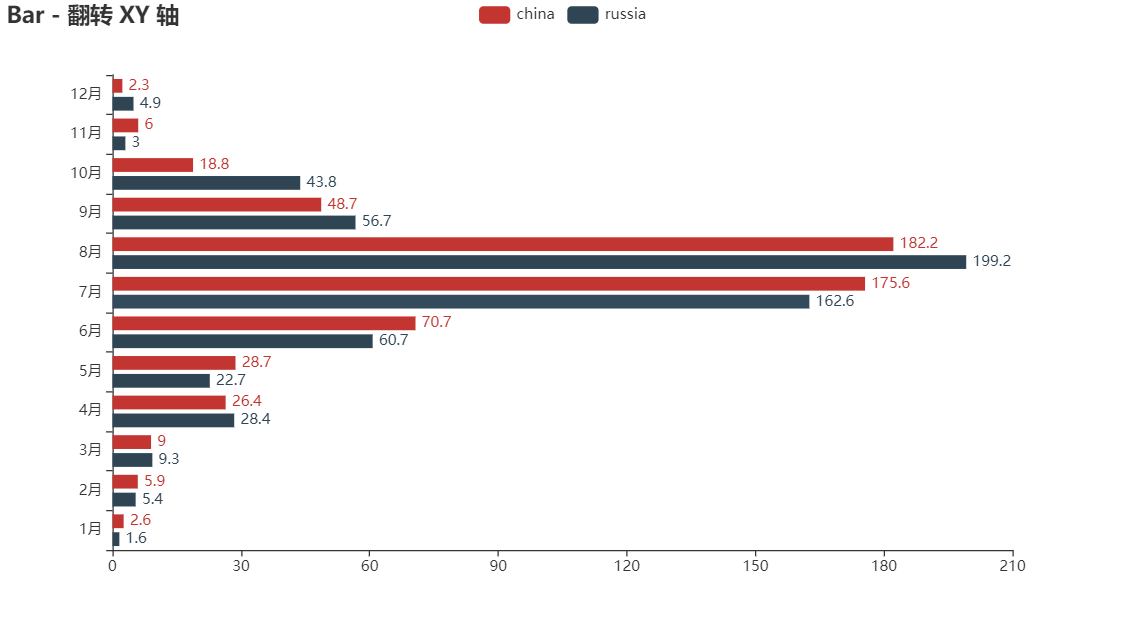 有时候,柱状图太高不方便看,我们还可以将 x 轴和 y 轴互换,生成横向的柱状图。多柱状图和 xy 轴互换不冲突,可叠加使用。