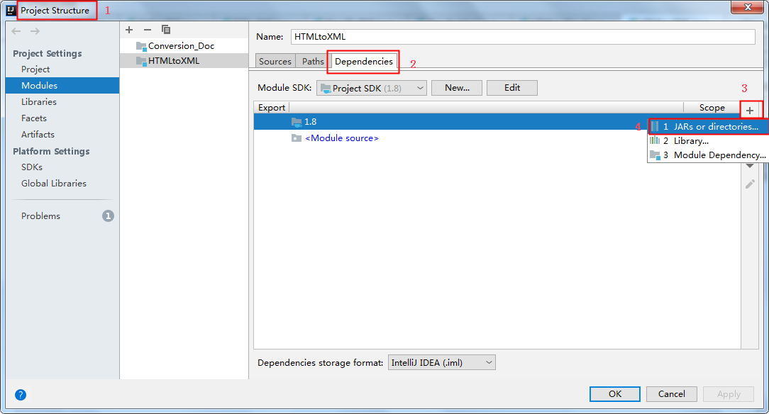 如需手动导入,需要下载jar包到本地,然后解压,找到lib文件夹下的Spire.Doc.jar文件。在IDEA中打开“Project Structure”界面,执行如图步骤将本地路径下的jar文件手动引入Java程序: