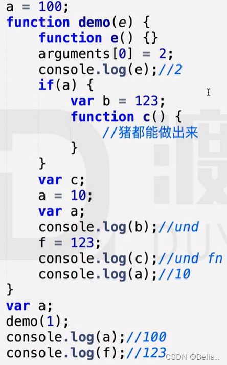 目录 1.1 语法分析 1.2 预编译 1.2.1 函数声明整体提升 1.2.2 变量 声明提升 1.2.3 imply global暗示全局变量 1.2.4 预编译四部曲(预编译发生在函数执行的前一刻) 1.3 解释执行 总结 1.1 语法分析 预编译之前,先通篇扫描看看有没有语法错误 1.2 预编译 1.2.1 函数声明整体提升 声明函数的时候不管你写到哪里,都会把这个函数整体提升到最前面 1.2.2 变量 声明提升 只是把var a:提升到前面去,输出结果为undefined,声明提升 d