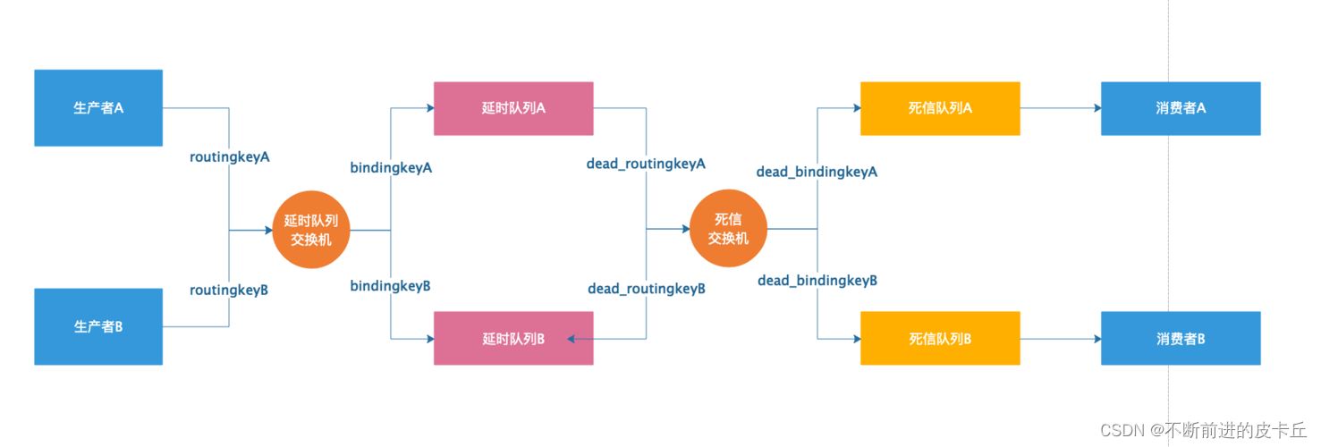 延迟队列就是想要消息延迟一段时间后被处理,TTL可以让消息在延迟一段时间后变成死信。变成死信的消息都会被投递到死信队列中,这样的话,只要消费者一直消费死信队列里面的消息就可以了,因为里面的消息都是希望被马上处理的消息 生产者生产一条延时消息,根据需要延时时间的不同,通过不同的routing key把消息路由到不同的延迟队列,每一个队列都设置了不同的TTL属性,并且绑定在同一个死信交换机中,消息过期了以后,根据routing key的不同,又会被路由到不同的死信队列中,消费者只需要监听对应的死信队列进行处理就可以了。注意:不要造成重复消费