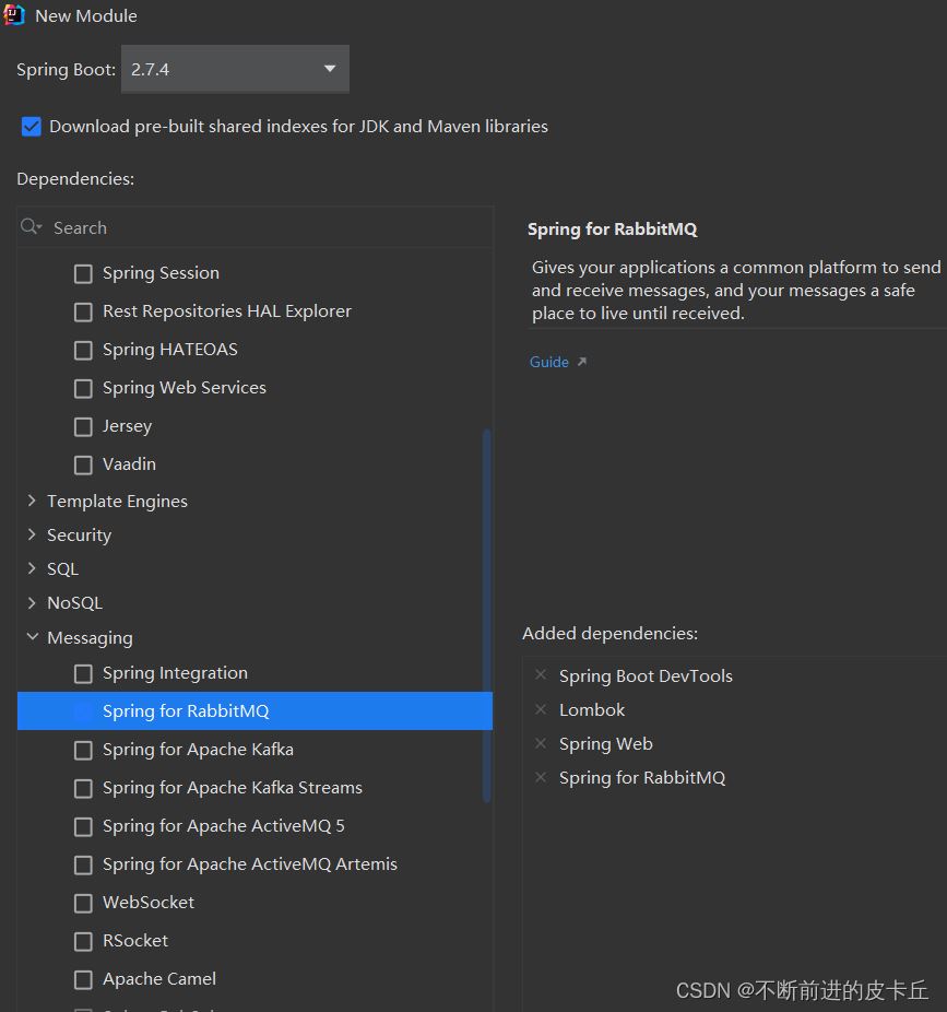 <dependencies> <dependency> <groupId>org.springframework.boot</groupId> <artifactId>spring-boot-starter-amqp</artifactId> </dependency> <dependency> <groupId>org.springframework.boot</groupId> <artifactId>spring-boot-starter-web</artifactId> </dependency> <dependency> <groupId>org.springframework.boot</groupId> <artifactId>spring-boot-devtools</artifactId> <scope>runtime</scope> <optional>true</optional> </dependency> <dependency> <groupId>org.projectlombok</groupId> <artifactId>lombok</artifactId> <optional>true</optional> </dependency> <dependency> <groupId>org.springframework.boot</groupId> <artifactId>spring-boot-starter-test</artifactId> <scope>test</scope> </dependency> <dependency> <groupId>org.springframework.amqp</groupId> <artifactId>spring-rabbit-test</artifactId> <scope>test</scope> </dependency> </dependencies>