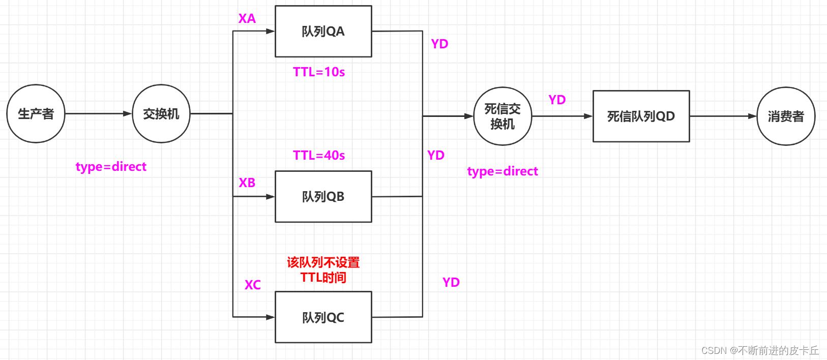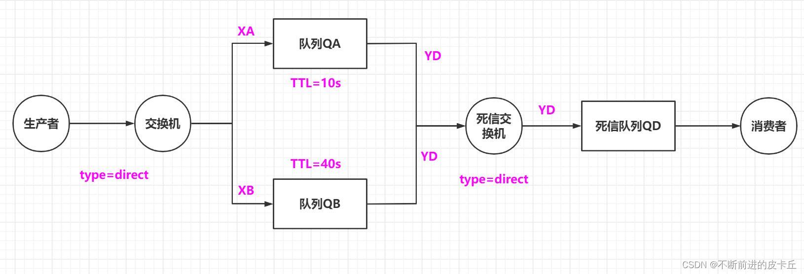 但是这种方式有一种缺点,现在我们只有TTL为10s和40s的延迟队列,如果我们需要其他延时时间的队列的话,那么我们又得新增其他队列,这样其实并不方便,我们想要的是能够动态设置TTL,这样就不需要为每个TTL设置新的延迟队列了。