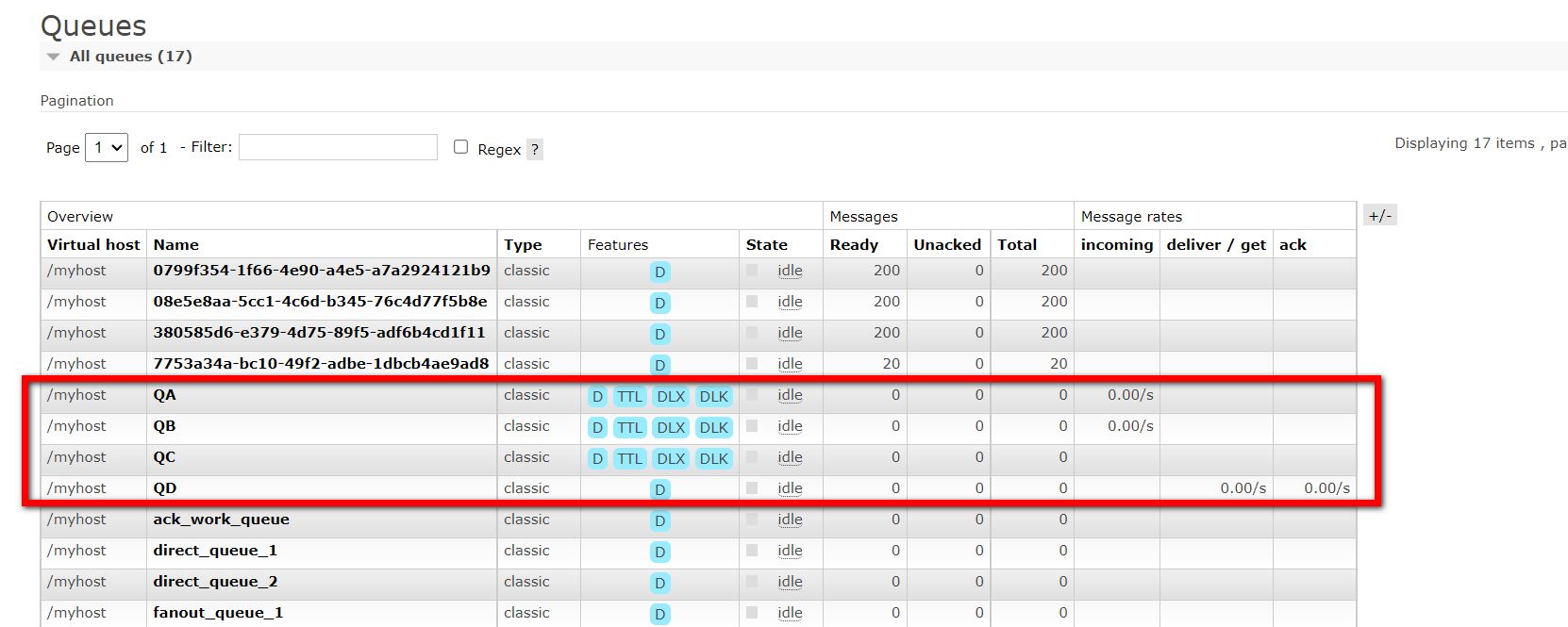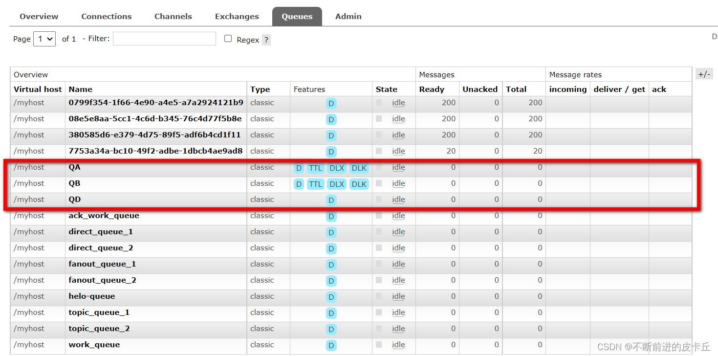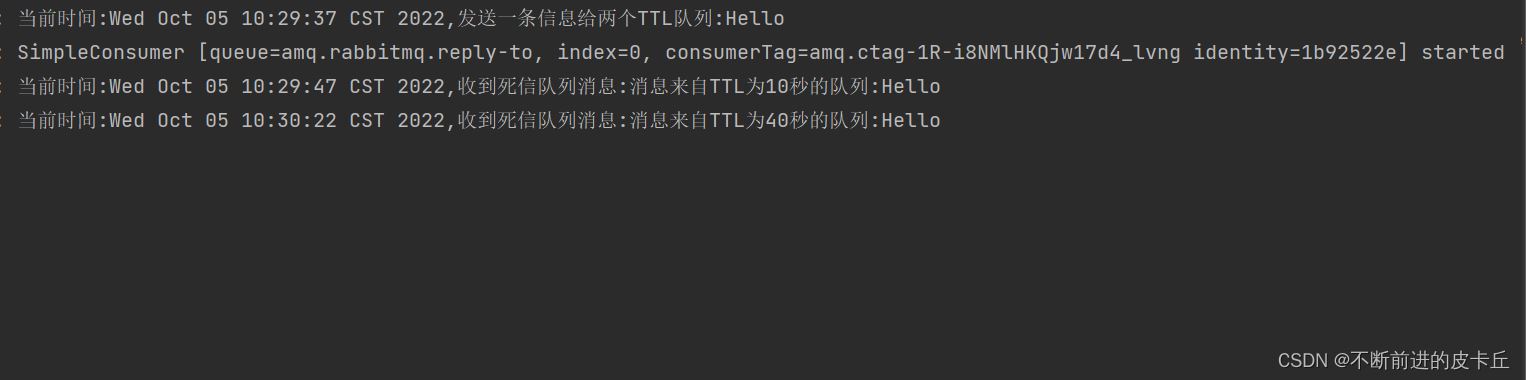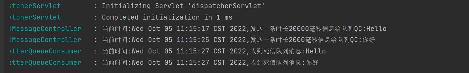 @Slf4j @Component public class DeadLetterQueueConsumer { @RabbitListener(queues = TtlQueueConfiguration.QUEUE_D) public void receiveQD(Message message, Channel channel){ //获取消息 String msg=new String(message.getBody()); log.info("当前时间:{},收到死信队列消息:{}",new Date(),msg); } }