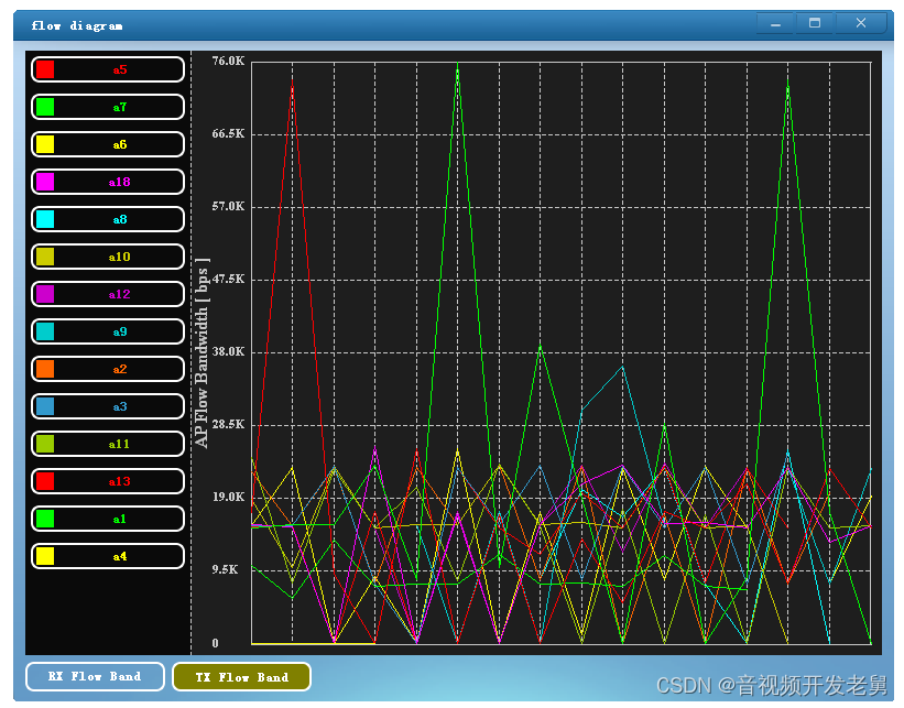1、由于设备较多,超过100台,所以不可能每个设备的流量曲线都用一种颜色,因此只选择几种比较明显的颜色作为设备的流量曲线颜色,每次上来一个设备,就用其中的一种颜色绘制曲线。