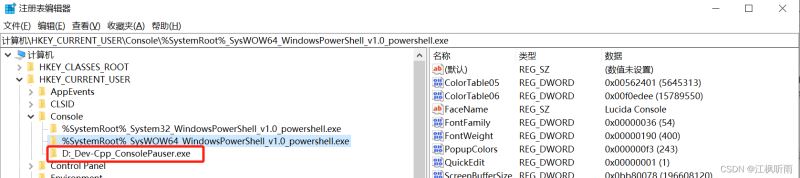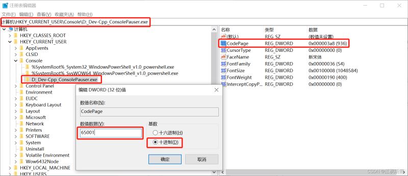 右侧修改HKEY_CURRENT_USER\Console\D:_Dev-Cpp_ConsolePauser.exe 的CodePage值为65001
