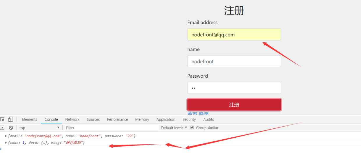 尝试去登录注册一下,打开控制台,就可以看得到相关后台返回的数据