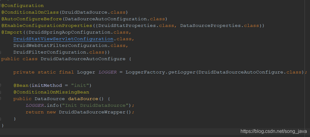 DruidDataSourceAutoConfigure.java中的内容如下,跟我们之前介绍的dataSource的例子差不多,都是使用了几个常用的注解来实现自动配置。