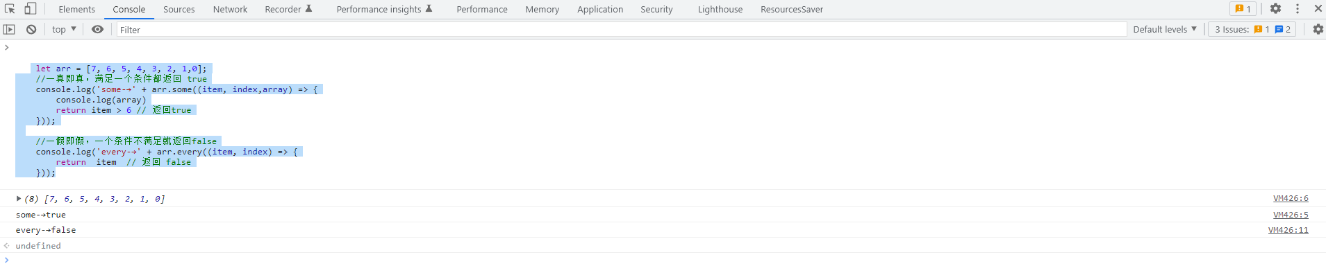 let arr = [7, 6, 5, 4, 3, 2, 1,0]; //一真即真,满足一个条件都返回 true console.log('some-→' + arr.some((item, index,array) => { console.log(array) return item > 6 // 返回true })); //一假即假,一个条件不满足就返回false console.log('every-→' + arr.every((item, index) => { return item // 返回 false }));