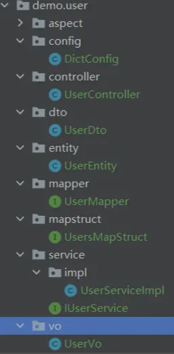 相关代码可由逆向工程去生成,我们就简单的编写了从控制层请求到服务层的业务处理再到dao层的数据处理,在这里我就一一将代码展示出来了各位还需要自己多动手。下面就直接上代码结构图