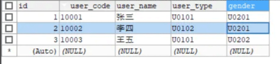 CREATE TABLE `t_user` ( `id` BIGINT(12) NOT NULL AUTO_INCREMENT, `user_code` VARCHAR(20) NOT NULL, `user_name` VARCHAR(50) NOT NULL, `user_type` CHAR(5) NOT NULL COMMENT '用户类型 -> U0101:普通用户,U0102:VIP用户', `gender` CHAR(5) NOT NULL COMMENT '用户性别 -> U0299:未知,U0201:男,U0202:女', PRIMARY KEY (`id`) ) CHARSET=utf8mb4 COLLATE=utf8mb4_general_ci;