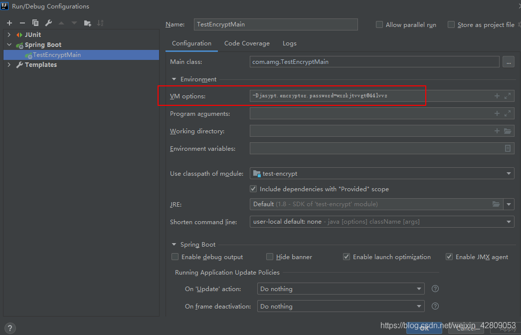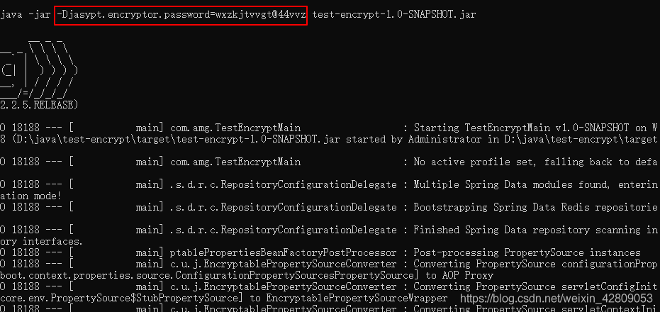 启动的时候加上-Djasypt.encryptor.password= 密钥 ;这里的密钥为 wxzkjtvvgt@44lvvz,如果密钥错误,项目是启动不成功的,通常报的错都是数据库连接失败,这也挺正常的,因为如果是错误的密钥,密文信息就无法解密,得到的自然是不符合的信息,所以会报错