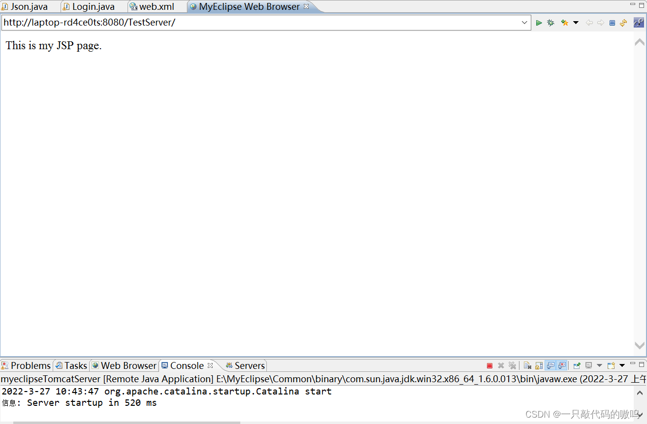 3.TestServer必须运行起来,右击TestServer项目,点击Run As – 3 MyEclipse Server Application,弹出如下界面则表示成功