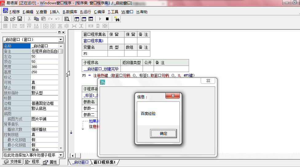 这个“信息框 (“百度经验”, 0, )”代码是跳出信息框的,按下F5就执行信息框代码, “.如果真 (参数一 = F5)”下面你写什么代码它就会执行什么。