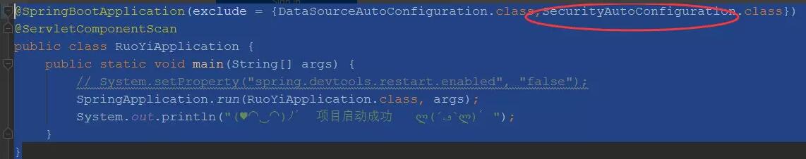 @SpringBootApplication(exclude = {DataSourceAutoConfiguration.class,SecurityAutoConfiguration.class}) @ServletComponentScan public class RuoYiApplication { public static void main(String[] args) { // System.setProperty("spring.devtools.restart.enabled", "false"); SpringApplication.run(RuoYiApplication.class, args); System.out.println("(◠‿◠)ノ゙ 项目启动成功 ლ(´ڡ`ლ)゙ "); } }