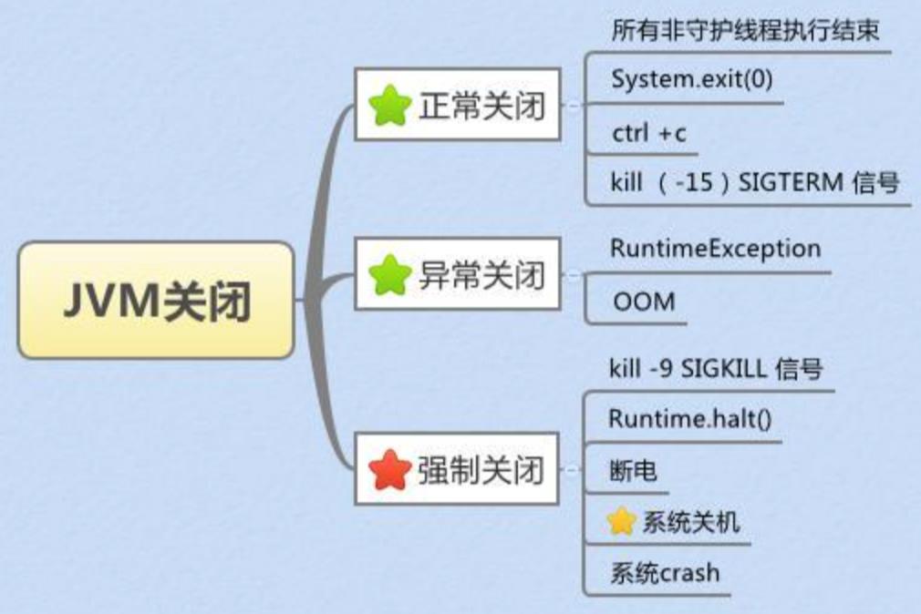 JVM关闭的情况如下图所示分为三类,第一种是正常的关闭,第二种是异常关闭的情况,第三种是强制关闭的情况。