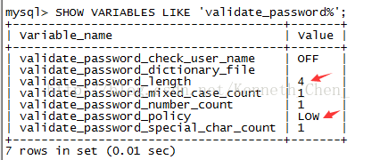 查看密码强度规格:SHOW VARIABLES LIKE 'validate_password%';
