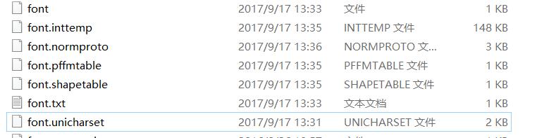 这时候文件夹中会多了四个文件,在unicharset,inttemp,normproto,pfftable文件名前面加上font.。如下图所示:
