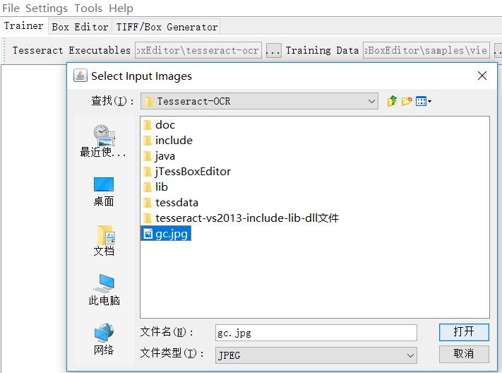 2、合并样本文件,打开jTessBoxEditor,点开train.bat。在菜单栏中Tools->Merge TIFF。在弹出的窗口中可以选择多张样本图片(网上之前有说要.tif格式的图片,测试.jpg格式的也行),我这边就用了一张样本图片。