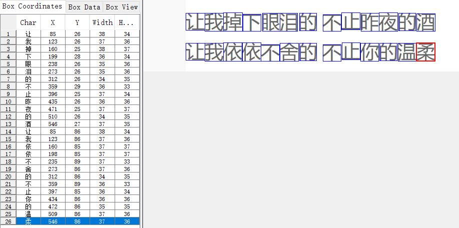 选择两个或两个以上的框,Merge可进行合并;Split将框进行拆分;Insert插入框,如果图片上一个框也没有,那无法进行插入;Delete删除框。选择要修改的字符框,在Character中输入想要修改的字,再点击齿轮,即可修改。修改后,如下图所示: