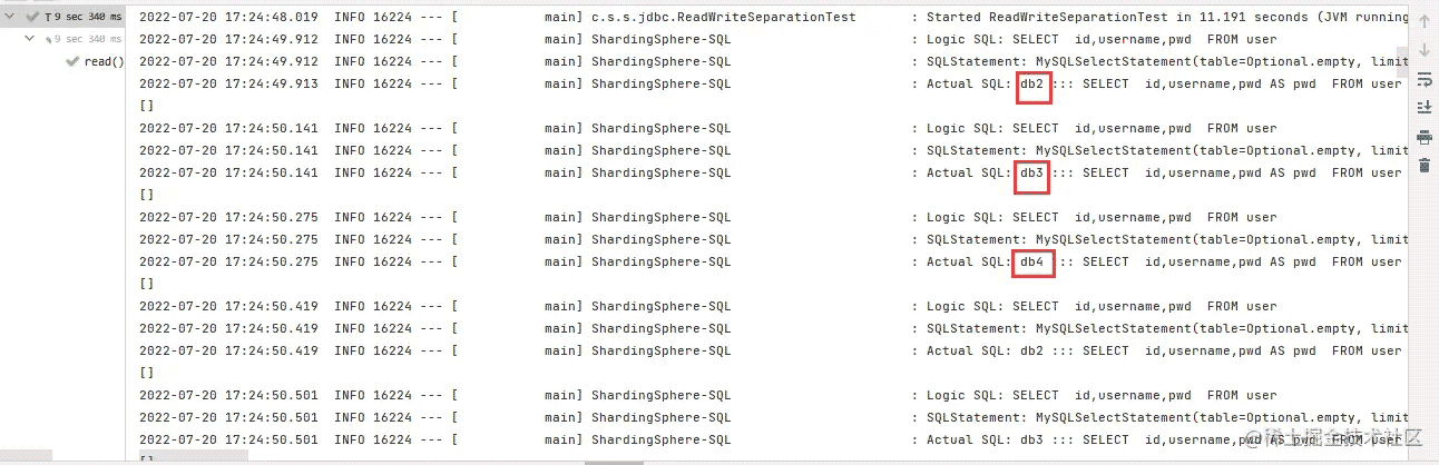 读操作配置的数据库是db2,db3,db4,配置的负载均衡算法是ROUND_ROBIN(轮询算法),所以查询请求会在三个库顺序查询。