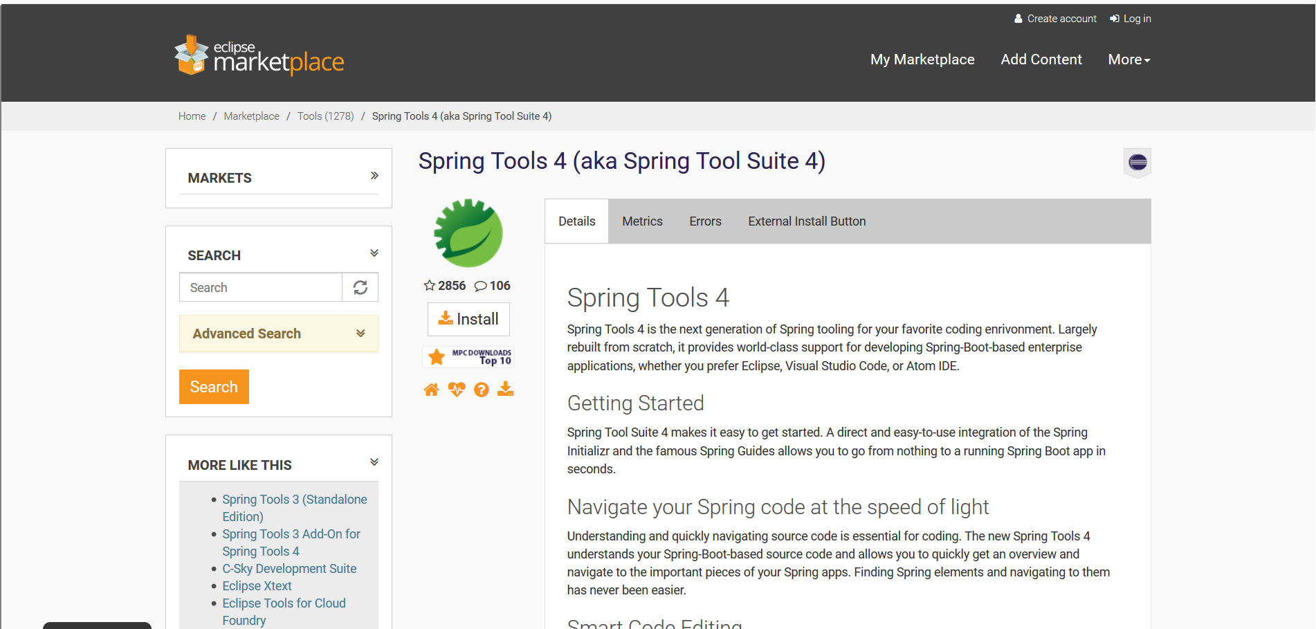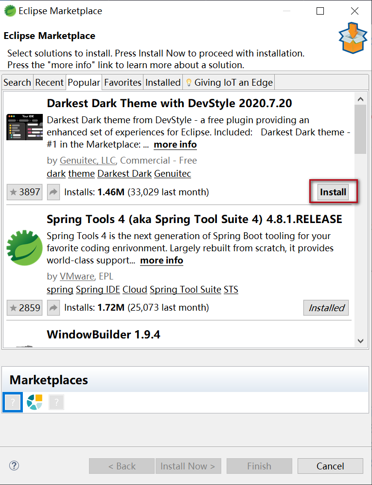 Help —>Eclipse Marketplace—>Popular,第一个就可以看到我们的目标,点击 install