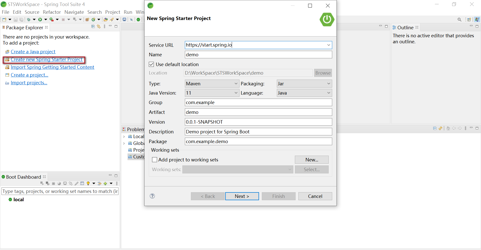 直接点击Package Explorer中的“Create new Starter Project”,创建Spring Boot项目