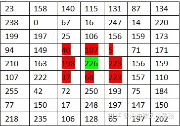 当前像素点为226的位置,我们对其周围5x5区域内像素点求平均计算方法为: