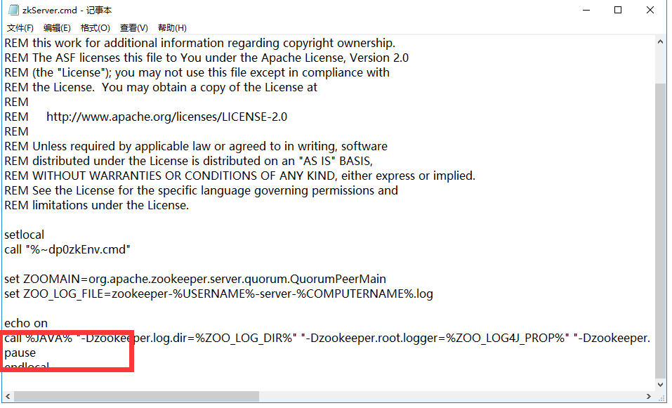在结尾的位置添加pause,然后双击运行zkServer.cmd,就会显示错误信息,而不是闪退的zkServer.cmd