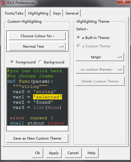 表现在IDLE界面上就是在python shell下,选择options—configure IDLE—-highlighting选项中,右侧的highlighting theme主题选择。