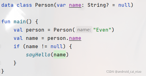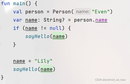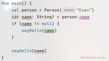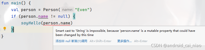 如上代码,IDE没有报错。我们通过添加一个val类型的name局部变量来保存person.name的值,这样的话,判断了name为不为空之后,即使person.name在子线程被设置为空了,但是局部变量name不会受到影响。我们在阅读一些系统源码的时候,不论是Java源码或是Kotlin的源码,经常发现别人在判断一个对象的属性的可空性的时候,都是先声明一个局部变量保存该对象属性再来判断,不懂事的时候就会奇怪别人为什么要多此一举,现在明白了,别人是为了预防直接判断对象属性出现的多线程修改带来的问题。