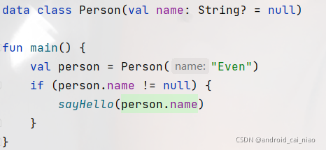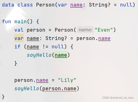 哎?我记得学Kotlin的时候有解释说如果已经判断了不是空了的话,就不需要添加 !! 符号的,为什么这里不添加的话会报错呢?其实原因就是报错信息上提示的,因为name是用var修饰的,而且这是一个成员变量,虽然你做了非空的判断,但是判断之后,这个成员属性有可能在其它线程被修改了,比如在其他线程设置为null了,所以,这样的话就会出现空指针异常了,所以添加 !! 符号来解决报错不是最佳实践,在我这个示例中,我们知道没有开多线程去修改person的name属性,所以可以加 !! 来解决,但是最好不要这样做,如果我们知道name属性不会被修改,则可以使用val修饰,如下: