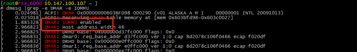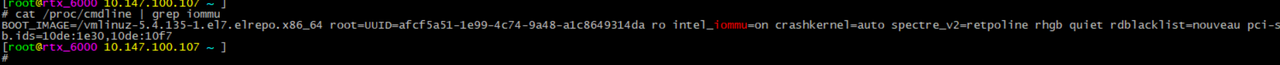 cat /proc/cmdline | grep iommu 结果输出: intel_iommu=on