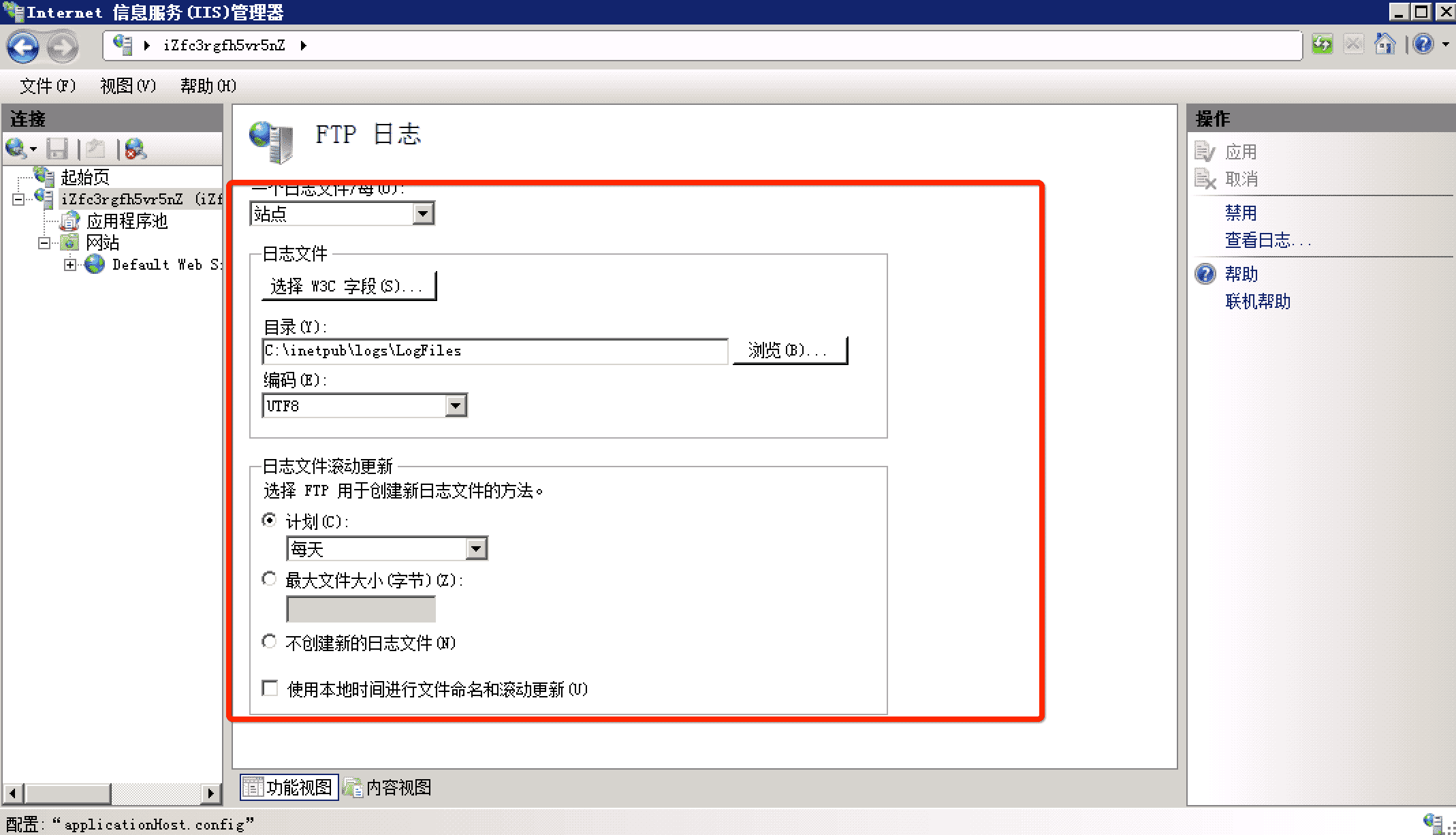IIS 中的 FTP 日志是默认启用的,您可以根据磁盘空间情况配置日志空间大小和其他策略。