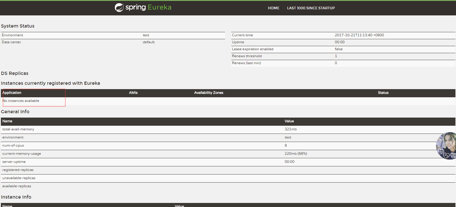 启动EurekaServerApplication,访问 http://localhost:9001/可以看到Eureka的页面,从红框的位置可以看到没有任务服务实例注册到当前的服务注册中心