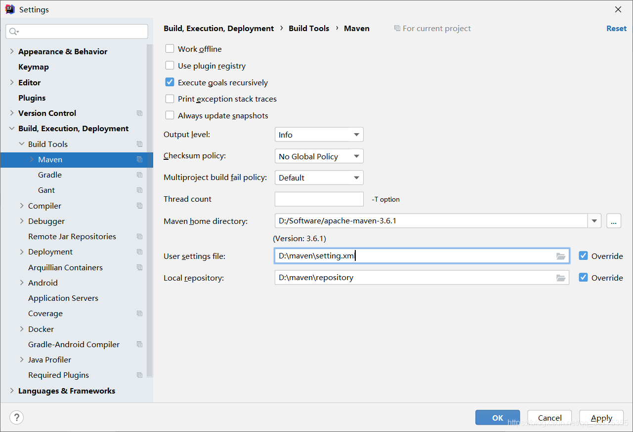 <?xml version="1.0" encoding="UTF-8"?> <settings xmlns="http://maven.apache.org/SETTINGS/1.0.0" xmlns:xsi="http://www.w3.org/2001/XMLSchema-instance" xsi:schemaLocation="http://maven.apache.org/SETTINGS/1.0.0 http://maven.apache.org/xsd/settings-1.0.0.xsd"> <localRepository>D:\maven\repository</localRepository> <mirrors> <mirror> <id>central</id> <name>central</name> <!-- 将镜像地址设置为本地maven地址 --> <url>file:\\D:\maven\repository</url> <mirrorOf>*</mirrorOf> </mirror> </mirrors> </settings>