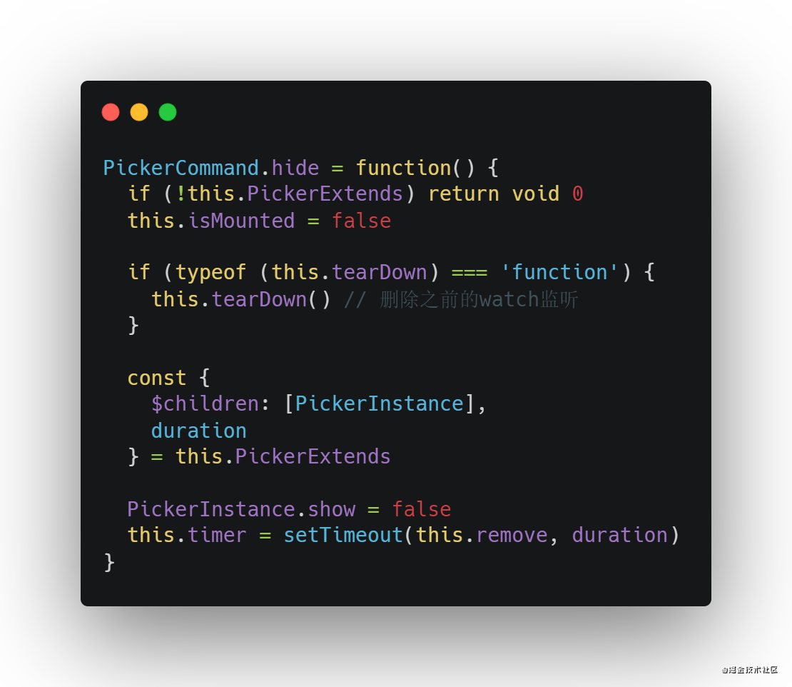 remove函数作用是删除真实DOM、清除延时器、将timer以及Picker实例置为null, 调用GC
