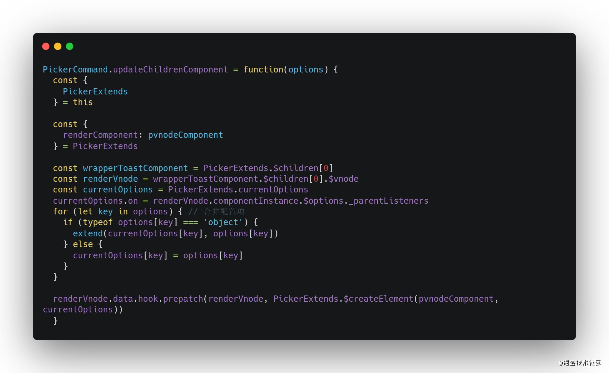 Picker组件完成后,发现更改传入组件的里的props没有重新,所以这里写了一个手动触发更新组件的函数,组件vnode有4个钩子函数,prepatch是做为update时调用,值有两个,第一个是上一次的vnode,而第二个就是更改后的vnode,所以我们在PickerCommand函数里预暂了原先vnode以及Component,做为diff的旧vnode,调用此函数既可以更新组件