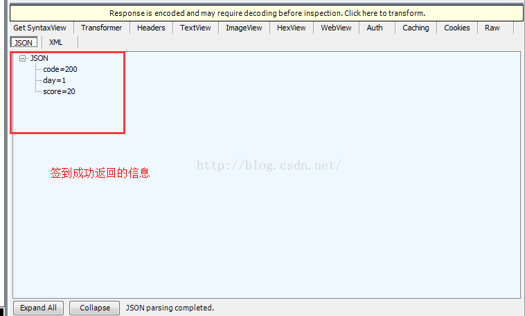 下面是签到成功返回的信息:code=200表示请求成功,day=1表示连续签到一天,score=20表示获得的积分数