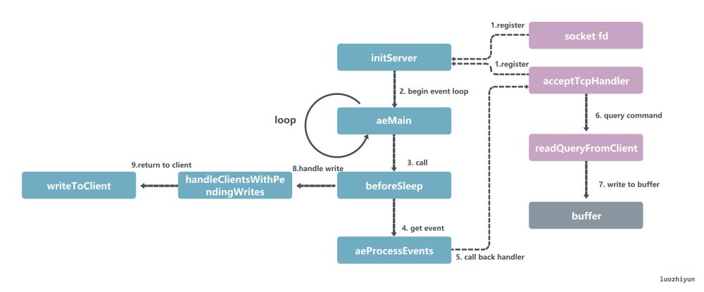 如: accept 对应 acceptTCPHandler 事件处理器、read & write 对应readQueryFromClient 事件处理器等,然后通过事件的循环派发的形式将事件分配给事件处理器进行处理。