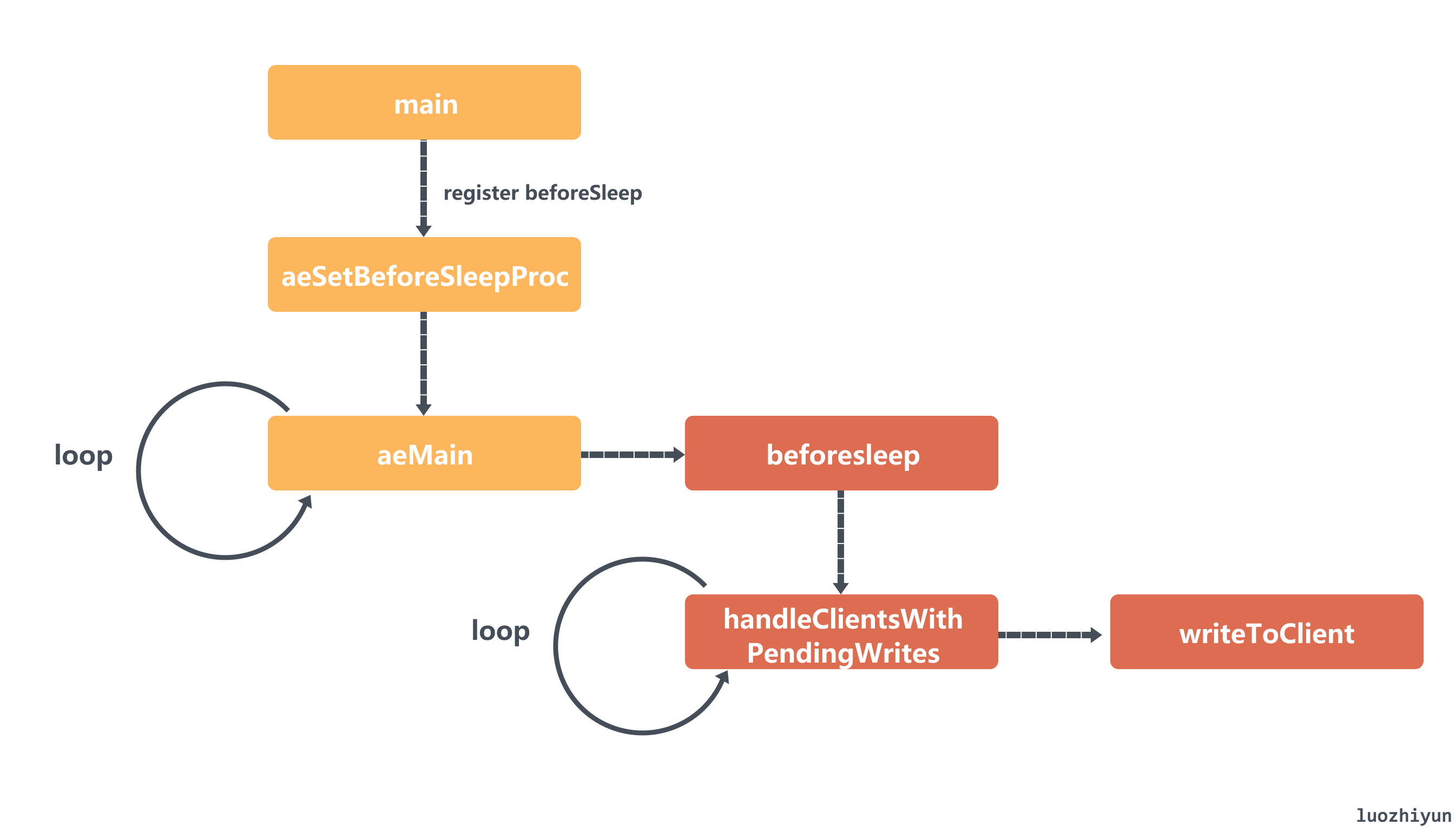 - 首先 Redis 会在 main 函数中调用 aeSetBeforeSleepProc 函数将回写包的函数 beforeSleep 注册到 eventLoop 中去;