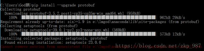 这时出现protobuf 依赖包(setuptools)安装问题,即要升级setuptools(23.0.0->39.0.0)时出现问题:
