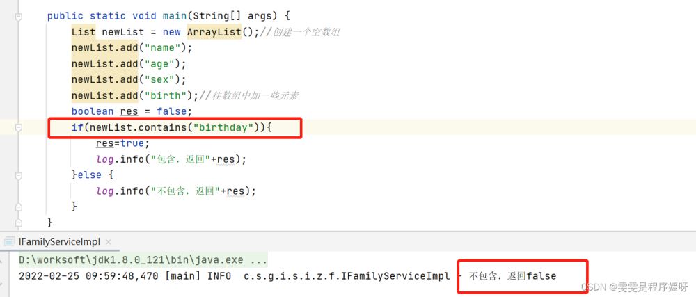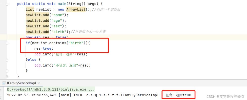 list集合中contains() 用于判断集合中 是否 包含指定的元素。list会将括号内的元素和list中存在的元素进行逐个比对,若有相等的,返回结果为true,若没有则返回结果为false。
