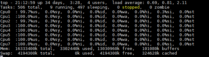 再次使用top查看CPU使用情况,可以看到us使用100%了。