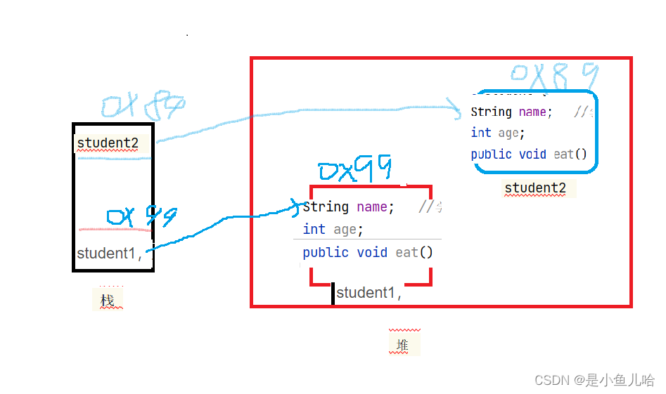 1、Student student1 声明对象,会在栈上开辟一块区域,名叫student1,里面存了:堆中开辟的内存的地址