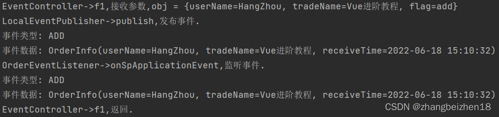 3.本例是事件同步处理机制,即发布事件后,会同步监听事件。