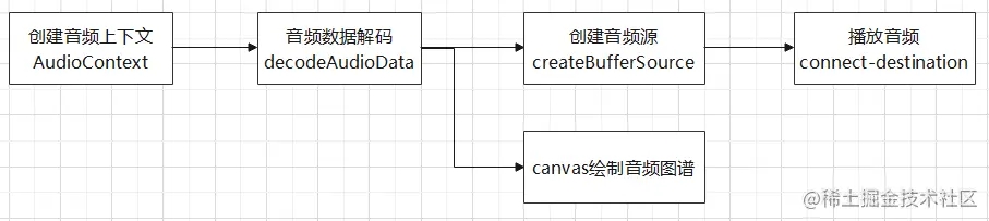 拿到音频数据之后,我们需要利用Web Audio Api,来处理音频数据,实现音频的播放,暂停等操作以及我们后续的波形图绘制。这里简单介绍下,Web Audio Api是一组非常强大的Api,它提供了在Web中控制音频、处理音频的一整套有效通用的系统。它能够允许开发着,控制音频,自选音频源、对音频添加特效,使音频可视化,添加空间效果,添加混响等等。而我们今天要实现的功能,仅仅只用到了其中几个Api,整体流程如下: