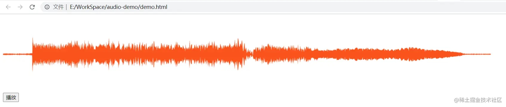 这样,简单的音频波形图绘制就完成了。小编这里仅做抛砖引玉,简单介绍下Web Audio的一个应用场景。更多更复杂的应用,大家可以深入了解学习Web Audio相关api。最后,贴一下效果图: