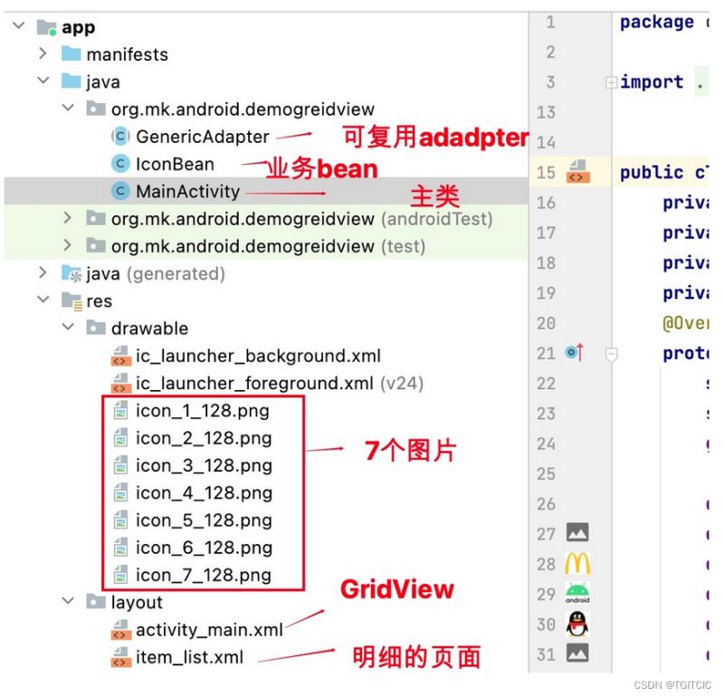 我们课程目标就是实现一个可以复用的Adapter,它带有一个ImageView一个TextView。